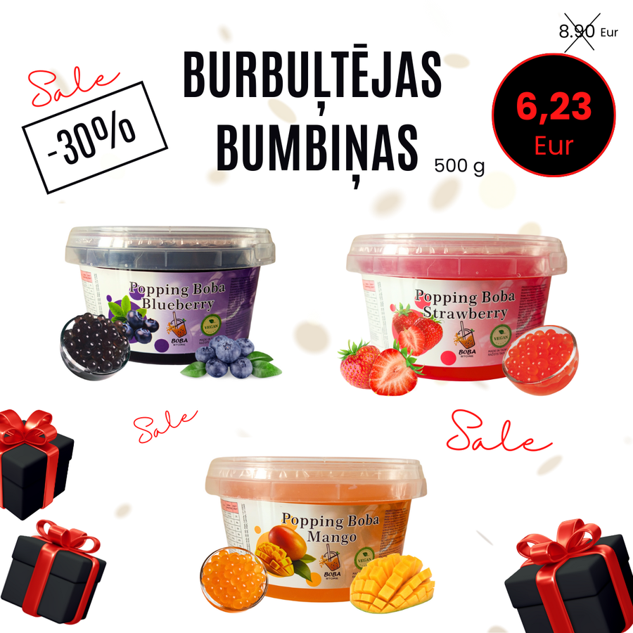 Sulīgas augļu bumbiņas, kas piešķir dzērieniem īpašu garšas akcentu. Popping boba – ideāla izvēle burbuļtējai, desertiem un kokteiļiem. Vairāk nekā parasta piedeva!