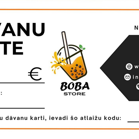 ✔️ Dāvanu kartes saņēmējs varēs to izmantot www.bobastore.eu, ievadot atlaižu kodu pasūtījuma noformēšanas brīdī.